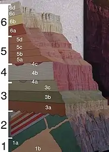 Et geologisk tværsnit af Grand Canyon Supergruppen. De sorte tal er grupper, og de hvide er formationer