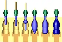 Formblæsning er en af de mest almindelige metoder til fremstilling af ting af termoplast med hulkroppe. Metoden er en videreudvikling af ekstrudering, og fungerer lidt som glaspustning. En rør trykkes ud fra en ekstruder, og ned i et kammer som har den ønskede form. Når polymerrøret er lige så langt som formen, lukkes kammeret helt og gas strømmer ind. Gassen fylder røret (som lukkes i bagenden), og presser det ud til det har samme form som kammeret. Formen kan derefter nedkøles og produktet tages ud. Et vigtigt eksempel på denne proces er fremstillingen af PET-flasker.[1]