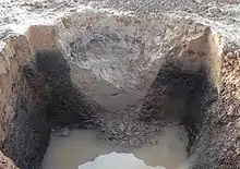 I historisk tid blev gruben gravet ved hjælp af en hakke med et kort træskaft påsat et skulderblad af en bison. To kvinder hjalp hinanden; en stod i gruben og gravede hullet, mens den anden stod på hyttegulvet og bar jorden væk. Det tog næsten tre dage at få gruben dyb og bred nok.[19] Siderne blev dækket med tørt græs og bunden med først pilegrene, så græs og til sidst et skind. Toppen var forseglet med (nedefra og op) skind, et tykt lag græs, brædder, græs igen, et skind, jord og allerøverst jord og aske som camouflage.[19]