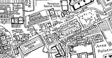 Forum Romanum lå, hvor mange veje mødtes. Af dem havde Via Sacra – den hellige vej – en særlig betydning; den går hen over Forum og dens brolægning kan spores tilbage til ca 550 f.Kr. Byens torv var også stedet for en række offentlige bygninger. Ved siden af Via Sacra lå Regia (= kongelig), der tjente som kongsgård før indførelsen af republikken. I Regia har man fundet en helligdom for krigsguden Mars og for overflodens gudinde Ops (gift med Saturn). I Mars' helligdom opbevaredes hans spyd og skjolde, regnet som den første af de syv talismaner, der sikrede Roms velstand og lykke. Plutarch beretter, at under kong Numa Pompilius, der havde efterfulgt Romulus som konge, blev Rom plaget af en frygtelig pest. Fra himmelen drattede pludselig et skjold af bronze ned i kong Numas hænder. Derefter ophørte pesten. Numa erfarede fra nymfen Egeria og muserne, at skjoldet var sendt til værn for Rom. Kongen beordrede derfor smeden Mamurius Veturius[4] til at lave 11 kopier. Det lykkedes han med, så ikke engang kong Numa kunne skelne originalen fra kopierne. Den tolv skjolde (ancilia) blev betroet Mars' præsteskab (salii) til opbevaring og anvendelse ved den krigsdans, de fremførte i marts og i oktober (dvs. starten og afslutningen af sæsonen for krig). Krigsdansen bestod af saliis sange til lyden af spyd, der blev hamret mod skjoldene, og deres hoppen (to korte hop på samme fod, og et hop af samme længde som de to, men på den anden fod).[5]