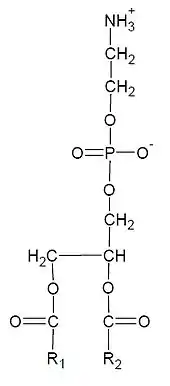 Strukturformlen for fosfatidylætanolamin. R1 og R2 angiver carbonkæder.