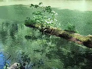 Jordlevende og vandlevende fototrofer: Planter vokser på en væltet stamme, som flyder i algefyldt vand.