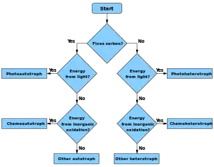 Et flowchart, der kan afgøre, om en art er autotrof, heterotrof eller en undertype.