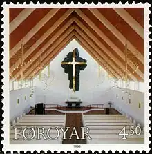 Kirken består af tre bygninger. Den bærende konstruktion er lavet i hvidmalet beton, mens bærende tagkonstruktion består af hvidt farvet limtræ. De indre vægge af skibet er lavet af hvidmalet beton, mens altervæggen består af hvidt malet, pudset armeret beton. Gulvet foran og bagsiden af kirken er af portugisisk skifer. Kirkens inventar blev også tegnet af Høgni W. Larsen. Altertavlen, alteret og prædikestolen er lavet af sort svensk granit og messing, mens døbefonten er lavet af færøsk søjleformet basalt og messing. Altertavlen vejer omkring seks ton og alteret omkring tre ton. Høgni W. Larsen har også designet den specielle lysekroner, lamper og messing lysestager. Klokken er støbt i Tønsberg i Norge af Olsen-Nauen og bærer teksten "jeg ringer i glæde, jeg ringer i sorg – vor Gud er så fast en borg". Kirkeskibet er en slup " Sjóborgin" som står i forkirken.