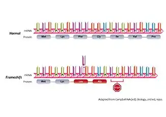 På dette billede ses en frameshift-mutation (af mRNA) hvor nukleotidet uracil (U) bliver slettet fra sekvensen, resulterende i en ændring af to udtrykte aminosyrer og et tidligt stop af proteinet.