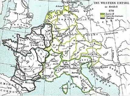 Efter at Karl den Skaldede forgæves havde forsøgt at erobre hele Mellemriget, fik Ludvig 3. af Frankrig tildelt den vestlige del af Mellemriget, Lotharingien.