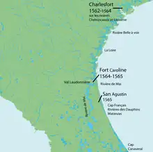 Karl 9. af Frankrig sendte i 1562 Jean Ribault og en gruppe Huguenot-nybyggere, under ledelse af admiral Gaspard de Coligny, i et forsøg på at kolonisere den atlantiske kyst og grundlægge en koloni, der skulle tage navnet Fransk Florida. De opdagede Port Royal Island, som senere kaldes Parris Island i South Carolina, hvorpå han byggede et fort ved navn Charlesfort. Gruppen, ledet af René Goulaine de Laudonnière, flyttede mod syd, hvor de grundlagde Fort Caroline ved Saint John-floden i Florida den 22. juni 1564.[7]