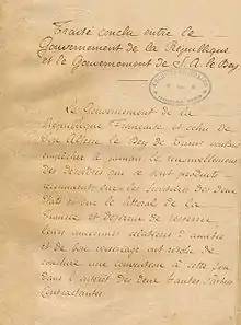 La Marsa-konventionen, undertegnet i 1883, ved bey Ali Muddat ibn al-Husayn, etablerede formelt det franske protektorat. Det fratog Bey Tunis kontrol over interne forhold ved at forpligte ham til at gennemføre administrative, retslige og finansielle reformer dikteret af Frankrig.[16]