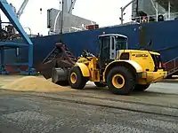 Gummiged der skraber korn sammen så kranen kan samle det op.