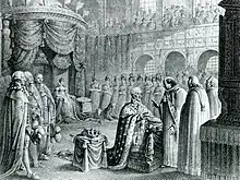 - Under enevælden (1660–1848) blev de danske konger formelt ikke kronede, men blot salvede af kirken, da de som arvekonger blev anset for at have fået deres magt fra Gud, og intet menneske derfor havde ret til at sætte kronen på deres hoveder. I daglig tale blev denne ceremoni dog også i samtiden omtalt som kroning.[1]