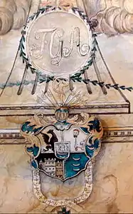 ![]() Frederik Georg Adelers monogram med Cort Adelers slægtsvåben forneden, akvarel på Søndre Brekke Gård i Skien | |