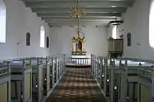 Kirken er ganske enkelt indrettet. Altertavlen er i barokstil og er fremstillet i 1766, da kirken blev bygget. Ved en større restaurering i 2003 blev altertavlen forgyldt og der blev indsat et nyt altermaleri af kunstneren Maja Lisa Engelhardt, som også har tegnet tæppet mellem alteret og knæfaldet. De to tidligere alterbilleder fra 1766 og 1866 er ophængt i kirken. Prædikestolen er den oprindelige fra 1766, mens døbefonten er en granitfont fra 1929, hvor den afløste en oprindelig træfont, som nu er anbragt på loftet. En syvarmet lysestage er en gave fra en sognebeboer. Orglet, som er på 12 stemmer, er udført af orgelbyggerfirmaet Bruno Christensen og Sønner, Terkelsbøl.