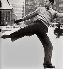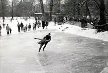 Frederiksberg Skøjteløber Forening, ca. 1958. Det samler ofte adskillige tilskuere, når elite kunstskøjteløberne træner på et afspærret område i kanalen ved Andebakken, Frederiksberg Have.