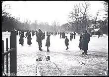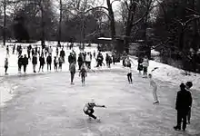 Frederiksberg Skjøteløber Forenings bane på Andebakkesøen, angiveligt begyndelsen af 1900-tallet. Den store mand uden skøjter, er foreningens opsynsmand, der står ved nedgangs-plankebroen til skøjtebanen. I baggrunden til højre ses Andebakkeøen, hvor skøjteløberforeningens konditortelt var rejst.