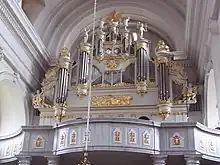 Kirkens første orgel stod oprindelig i sognets midlertidige trækirke. Orgelbygger Lars Wahlberg fik senere til opgave at bygge et orgel med 29 registre, to manualer samt pedal. Da orglet var færdigt i 1764, var antallet af registre blevet forøget til 34, som blev drevet af seks store bælge. Wahlbergs orgel blev i 1905 erstattet af et orgel i romantisk stil, bygget af Åkerman & Lund i Stockholm, men Wahlbergs orgel blev rekonstrueret i 1982-1987 af Grönlunds Orgelbyggeri. Åkerman & Lunds orgel befinder sig stadig i kirken, i afmonteret stand.