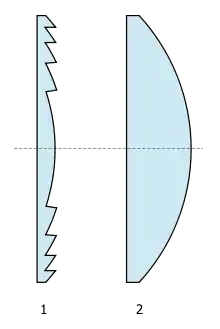 ![]() Tværsnit af en Fresnellinse (1) og almindelig linse (2) med samme brændvidde. |