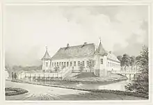 ![]() Frijsenborg Slot 1901, nogle år efter Ferdinand Meldahls genopbygning. | |
