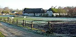 Præstegården på Frilandsmuseet Hjerl Hede med skolen og møllen i baggrunden