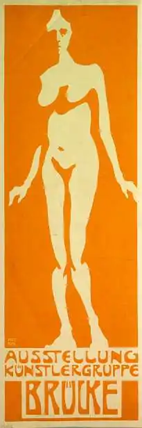 I september og oktober 1906 blev sammenslutningens første udstilling afholdt i Dresden. Udstillingen fokuserede på kvindelig nøgenhed.[5] Bleyl fremstillede en litografisk plakat til udstillingen trykt i orange blæk på hvidt papir. Det har en smal, portræt-format, som er nærmere beslægtet med japanske træsnit end konventionelle moderne udskrifter, og var en udpræget modsætning til den plakat, designet af Otto Gussmann for det Tredje tyske Udstilling af brugskunst, der var åbnet fire måneder tidligere i Dresden.[5] Politiets censorer nedlagde forbud mod plakaten, da de mente, at man kunne skimte kønsbehåring i skyggen under maven.[5]