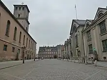 Frue Plads med Vor Frue Kirke til venstre og universitetet til højre.