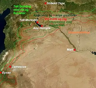 Omkring 10.900 f.Kr. medførte Yngre Dryas også en kraftig skovdød i store dele af den vestlige randzone, det vil sige steppelandet og højlandet rundt om det bjergparti, som strækker sig langs Middelhavet i dagens Israel, Libanon, Syrien og Tyrkiet. Tidlige jordbrugssteder som Abu Hureyra i den centrale del af det nordlige Syrien blev udsat for skovdød i et overgangslandskab, som både havde skov og vilde forekomster af rug og hvede.[6] Sandsynligvis forlod de midlertidigt deres landsby og bosatte sig i Tell Mureybit 50 km væk, dvs. på den anden side af Eufrat.[7]