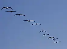 Fotografi fra Mexico af formationsflyvende brun pelikan (Pelecanus occidentalis).