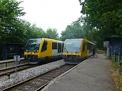![]() To regiosprintere krydser hinanden på Fuglevad Station. | |||