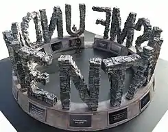 Bogstaverne er placeret på en 90 cm høj stålsokkel der danner en ring på 9 diameter. På soklens ydersiden og inderside, direkte under de enkelte bogstaver, projicerer 28 fladskærme kontinuerligt citater, fra de tre religioners helligste skrifter. Dels på det religiøse skrifts originalsprog og dels på dansk (eller på udstillingslandets lokale sprog).