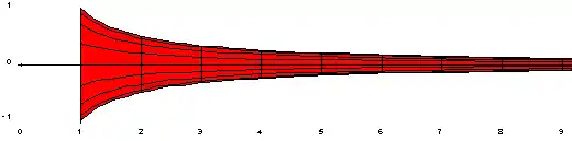 Gabriels horn er den figur der fremkommer, når man drejer grafen for for 360 grader omkring x-aksen. Ved brug af infinitesimalregning kan rumfanget og overfladearealet beregnes: