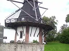 Galleriet i Skenkelsø Mølle, hvorfra møllen krøjes ved hjælp af krøjebjælkerne (som danner en trekant på bagsiden af vingerne)