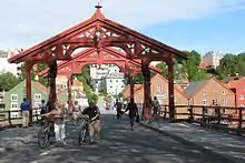 Øst for broen ligger Brubakken med cykelelevatoren Trampe.