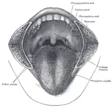 Musculus palatoglossus | Løfter bagsiden af tungen og strammer pharynx. | Lateralsiderne af aponeurosen, bevæger sig rundt i siden af den bløde gane hvor den danner den forreste ganebue og inserer så i siderne af tungen. |