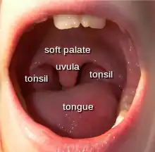 Bagsiden af den bløde gane, hvor overgangen til svælget forekommer, hænger frit ned i mundhulen i form af drøbelen, en lille bold af slimhinde. Siderne af den bløde gane overgår uden klar afgrænsing til svælgvæv.