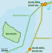 Den 26. september 2022 blev et læk af gas fra rørledningen Nord Stream 2 opdaget i Østersøen sydøst for Bornholm.[4] Flere timer senere blev yderligere to læk i rørledningen Nord Stream 1 opdaget nordøst for øen.[5] Begge gasrørledninger forbinder Rusland og Tyskland. Den svenske Kustbevakningen opdagede 27. september 2022 en fjerde lækage, den anden i Nord Stream 2.[6] Nord Stream 1 havde været i brug siden 2011, men var på tidspunktet for lækagerne lukket, angiveligt pga tekniske problemer, medens Nordstream 2 endnu ikke var åbnet, men fyldt med gas.