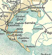 Kort over Karrebæk Fjord med Gavnø i midten.