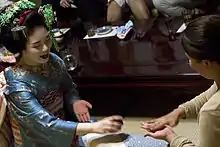 Kunden arrangerer en sammenkomst gennem geishabureauet(検番 kenban), som aftaler hver geishas aftaler og undervisning.