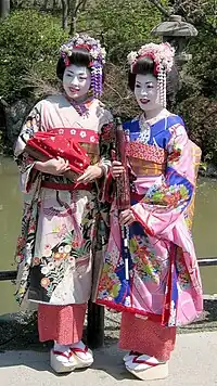 Geisha går altid i kimono. Lærlinge går i meget farverige kimonoer med højst overdådig obi. Obien er altid mere iøjnefaldende end kimonoen, for at give det påklædningen særlig eksotisk balance. Maiko har obien bundet på en facon der hedder ”darari”. Ældre geisha klæder sig i mere dæmpede mønstre og farver. Det er et kendetegn, at en geisha fra en meget velhavende okiya aldrig går med en kimono mere end én gang, hvilket betyder, at den pågældende okiya har opbevaringslagre, hvor kimonoer bliver udvekslet mellem geisha.