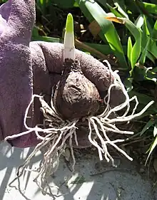 Kryptofytten Påskelilje, med løg, rødder og en spirende knop.
