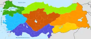 Der er syv geografiske regioner i Tyrkiet (tyrkisk: bölge) og de blev oprindeligt defineret på landets første geografikongres i 1941.[1] Disse syv regioner er underopdelt i enogtyve sektioner (tyrkisk: bölüm), som yderligere er opdelt i talrige områder (tyrkisk: yöre) som defineret af mikroklima og afgrænset af lokale geografiske formationer.