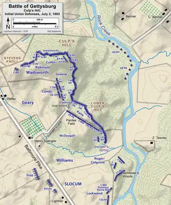 De voldsomme kampe på Unionens højre flanke var lige så vigtige som det mere berømte forsvar af Unionens venstre flanke den 2. juli af oberst Strong Vincents brigade på Little Round Top. I betragtning af at unionens linje kun lå 350 meter fra den vigtigste forsyningslinje – landevejen Baltimore Pike – kan man hævde, at den var mere vigtig. Greenes bidrag til dette kritiske slag blev aldrig udbasuneret, primært på grund af en strid mellem Meade og Slocum over indlevering af deres officielle rapporter. Men et medlem af Greenes brigade skrev: [16]