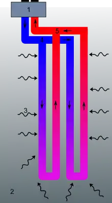 For at udnytte den geotermiske varme handler det i princippet om at bore to dybe huller, i en til tre kilometers dybde. Fra det ene hul oppumpes varmt vand med en temperatur på f.eks 73 °C, og ved hjælp af en elektrisk varmepumpe trækkes varmen ud af vandet så det køles til 17 °C. Den opsamlede varme fra vandet overføres derefter ved hjælp af en varmeveksler til forbrugerne via fjernvarmenettet.[3][7] Til sidst pumpes det lunkne vand tilbage ned gennem det andet hul (halvanden kilometer fra det første hul) for at opretholde trykket i sandstenslagene.[8]