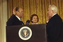 Den 8. august 1974 syntes alle muligheder for, at Richard Nixon kunne undgå en rigsretssag på grund af Watergate-skandalen at være udtømte, og han valgte derfor – som den hidtil eneste amerikanske præsident – at træde tilbage i utide. Gerald Ford blev taget i ed som USA's præsident af højesteretspræsident Warren Burger den 9. august 1974, hvorefter den nye præsident fulgte ekspræsident Richard M. Nixon ud til helikopteren på plænen bag ved Det Hvide Hus.