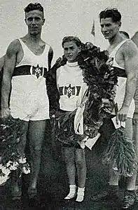 ![]() OL-mestrene fra 1936, fra venstre: Gerhard Gustmann, Dieter Arend og Herbert Adamski | |
