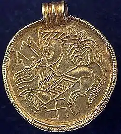 I årene mellem 400 og 500 e.v.t. stiger mængden af guld i arkæologiske udgravninger i Nordeuropa, dette hænger sammen med romernes udstrakte brug af fremmede lejesoldater, herunder germanere, i de mange krige der blev udkæmpet i Romerriget i denne tid. Omkring 600 svinder guldmængden atter i Nordeuropa, hvilket hænger sammen med de vestromerske provinsers kollaps og konsolideringen af de østlige. Med guldet følger også en ny fundtype, guldbrakteaterne, det er afbildninger på runde guldmedaljoner som er inspireret af romerske mønter, men udsmykket ud fra den lokale forestillingsverden og i en lokal stil, som bærer afbildninger af Balder, Tyr og Odin. Han var overklassens og kongernes gud, dem der havde råd til udstyr af denne type. Her blev en romersk teknik således brugt til at gengive klart germanske forestillinger.[35]
