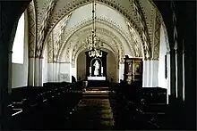 Kor og skib fik i sengotisk tid indbygget krydshvælv af den østjyske type på vægpiller. Halvkuppelhvælvet i apsis er nyopført. Ved en istandsættelse i 1900 afdækkedes kalkmalede dekorationer i hvælvene, ornamentikken blev hårdt opmalet. Altertavlen er et rammeværk fra 1869 med Thorvaldsens Kristus i gips. Prædikestolen er fra 1869.