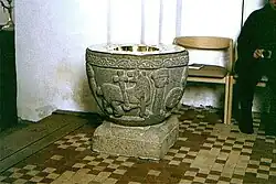Den romanske døbefont af granit har løver, korslam og fugl samt mandshoved på kummen.