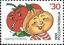 Hr. Tomat og figuren Cipollino på russisk frimærke i 1992.