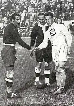 ![]() De to anførere og målmænd, Gianpiero Combi (til venstre) og František Plánička fra Tjekkoslovakiet (til højre), hilser på hinanden inden finalen om VM i fodbold 1934. | |