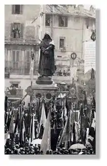 Bruno står for eftertiden som en oprører og martyr for tankens og talens frihed. I 1887 besluttede Roms bystyre at rejse et monument for ham på stedet hvor han blev brændt. Vatikanet protesterede, men blev overhørt. [8] Et monument udført af Ettore Ferrari blev rejst på Campo dei Fiori i 1889. Da romerne i 1907 rejste sig til oprør for at opnå den adskillelse mellem stat og kirke, man havde indført i Frankrig et par år forinden, strømmede menneskemængden til Brunos rettersted på Campo dei Fiori på mindedagen for hans død, 17.februar, mens de råbte "A basso il Papa!" (= Ned med paven!) [9]