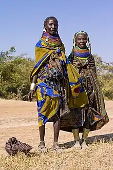 To gamle Muhuila-kvinder med tykke halsringe af glasperler og ler. Angola.